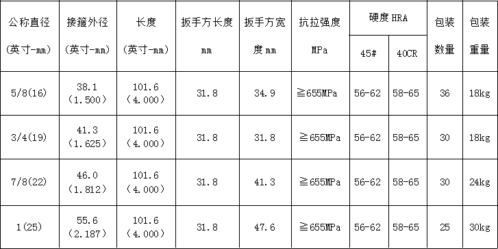 抽油桿接箍即是用于連接兩根抽油桿的接箍,抽油桿接箍兩端帶有螺紋,可以根據需要將不同直徑的抽油桿組合起來。我公司生產的接箍包括抽油桿接箍、異徑接箍倆種,它們均按照API Spec 11B規范設計,采用優質碳鋼或合金結構鋼(相當于AISI 1045或AISI 4135)制造而成。正常情況下,在接箍和外圓上有倆個扳手方,但根據用戶需要也可以提供無扳手方接箍。T級接箍在熱處理后的硬度為HRA56-62,具有較好的抗腐蝕性和耐磨性。